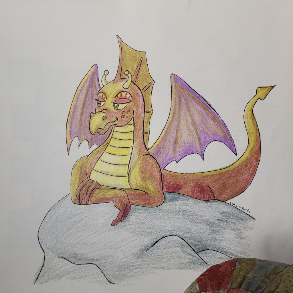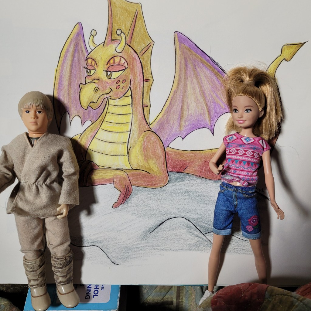 Edwin the Earnest is a magic dragon. He’s a cousin to Puff from Honnalee. And he only exists because my seriously old and stretched brain and arthritic hands created him with colored pencils and paper. He is the perfect one to explain about Mickey’s doll-collecting and quirky coot behavior.