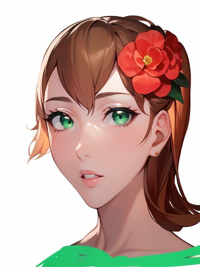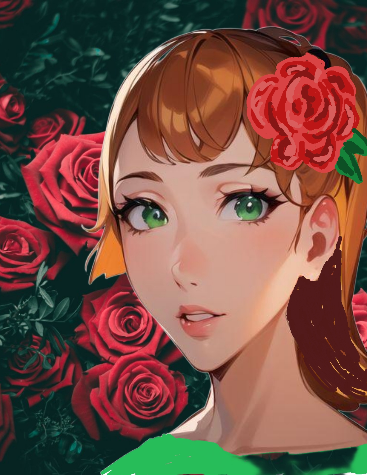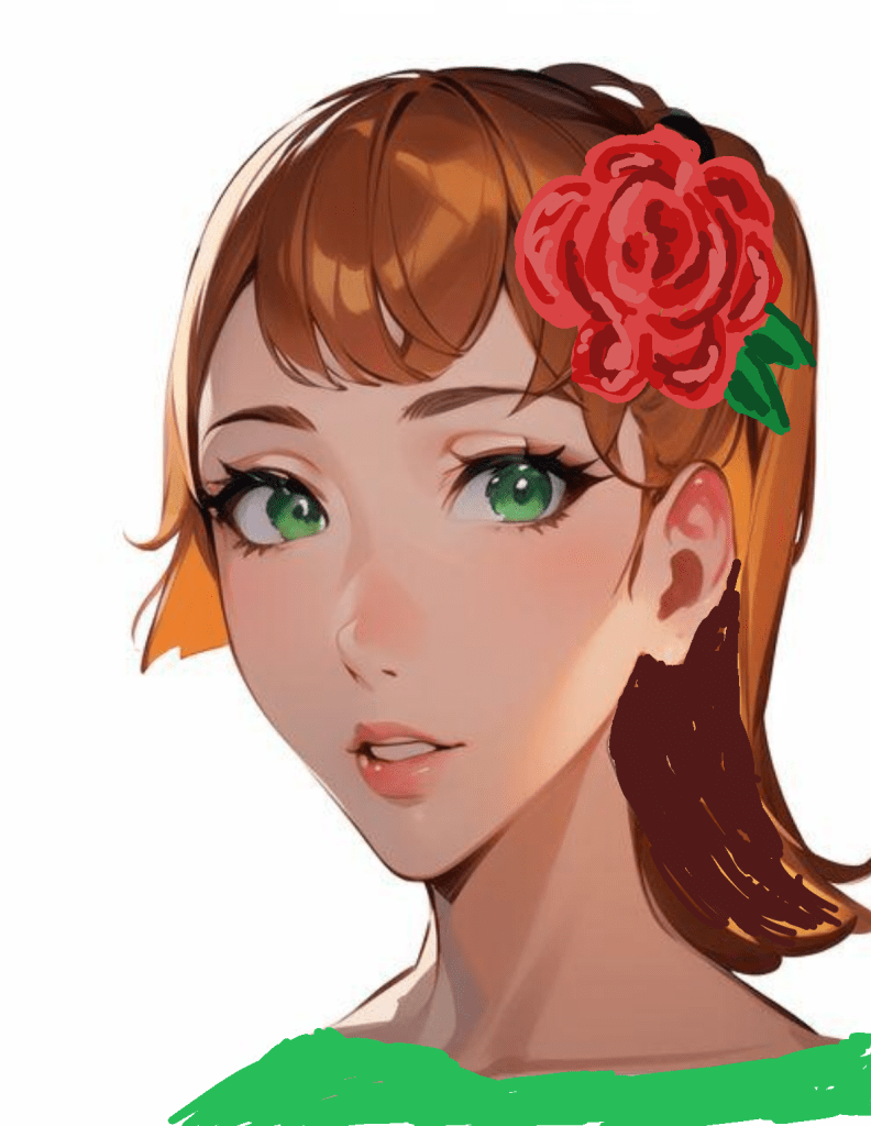 After fixing and fixing and fixing… and adding a rose in the hair… and something green to match the eyes, I came up with something I wanted to create a finished project out of. I did not take a screenshot of every little change, so you must imagine how I got here from Miss Ugly Puss.