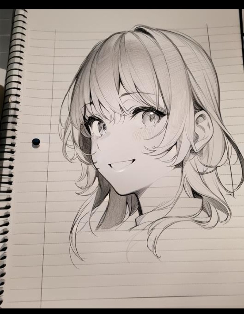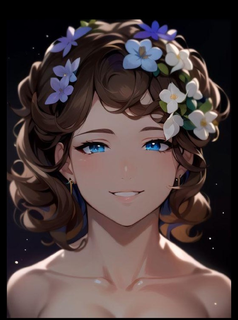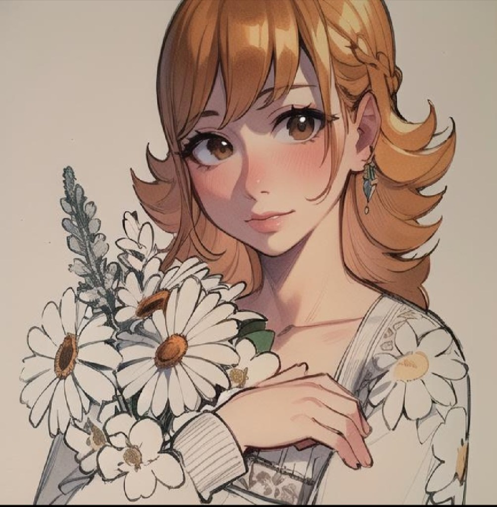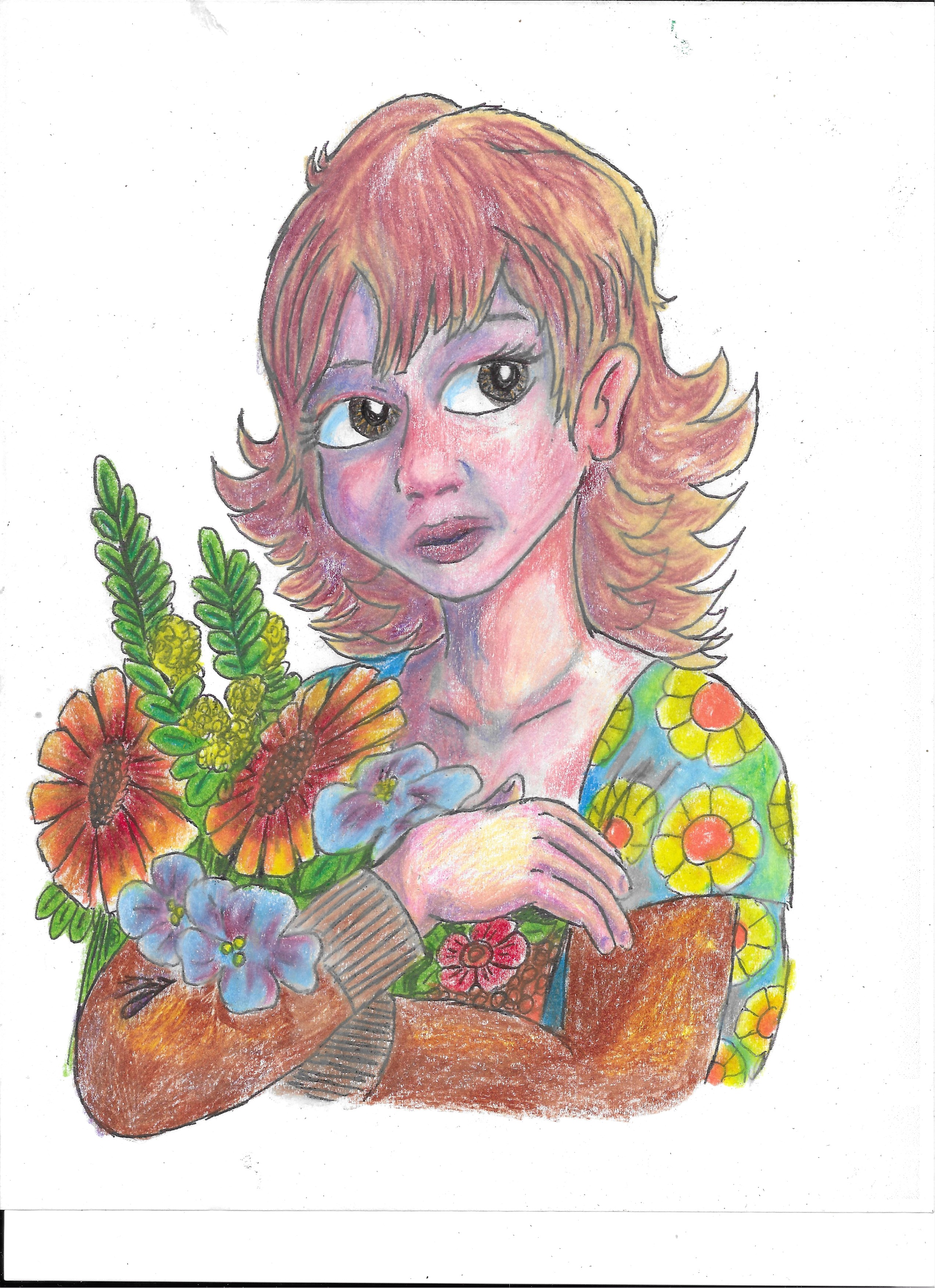 This is an artwork that I did earlier this year in colored pencil. I was not satisfied with my arthritis-impaired ability on this project. The eyes were too owlish and dark. The lips are too dark and thick. But you can’t erase colored pencils and ink on paper and fix things as easily as you can digitally on a touch screen. So, I used the AI Mirror to correct it.
