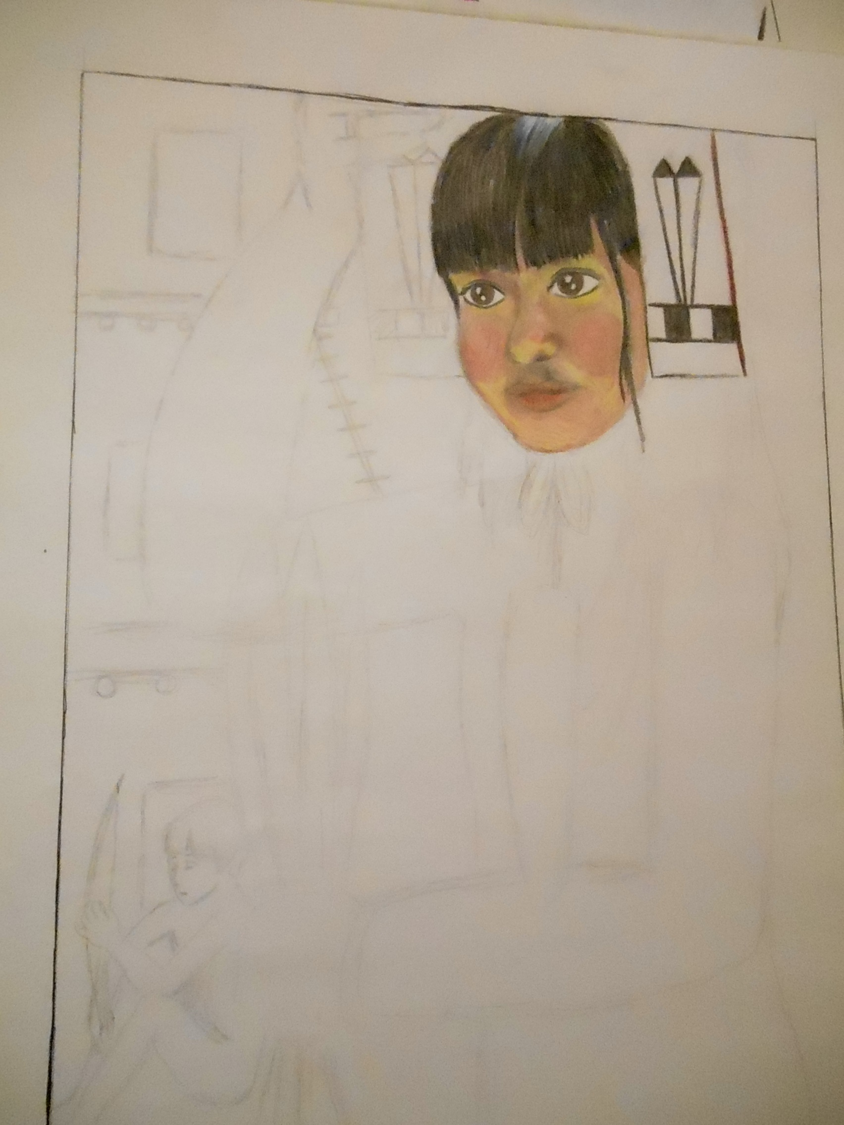 I sketched out the plan in light pencil, too light to really pick up in the photo. When I begin the detail work, I take it area by area, starting with the most important piece, the primary figure’s face.