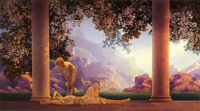 The innocent sylph bends down to wake her sister, the sleeping nymph. The morning has broken on a new day. The painting has existed since the 1920’s, probably his most famous work of all. He worked from a photograph to paint it. Several photographs, in fact. Wouldn’t the authorities be upset now, this man painting a naked girl? Artist or no, it could look like pornography to many in this day and age. Ironically, though, the nude person in the photo he used as a model was himself. It was only a matter of the play of light over the bare form. It was a matter of innocent yet sensual beauty. It was a matter of Maxfield Parrish Blue. The painting itself is far more subtly blue than it appears here. It is laughing blue. It is a mix of youth and grief, the birth of the new dawn and the ancient jagged hills behind. It is flowers and parched rock, waking and dreaming. The art of it is in the opposition of things, what Confucius meant when he taught of the Yin and the Yang, what Lao Tzu spoke of in the Book of the Tao. Yes, it was Laughing Blue.