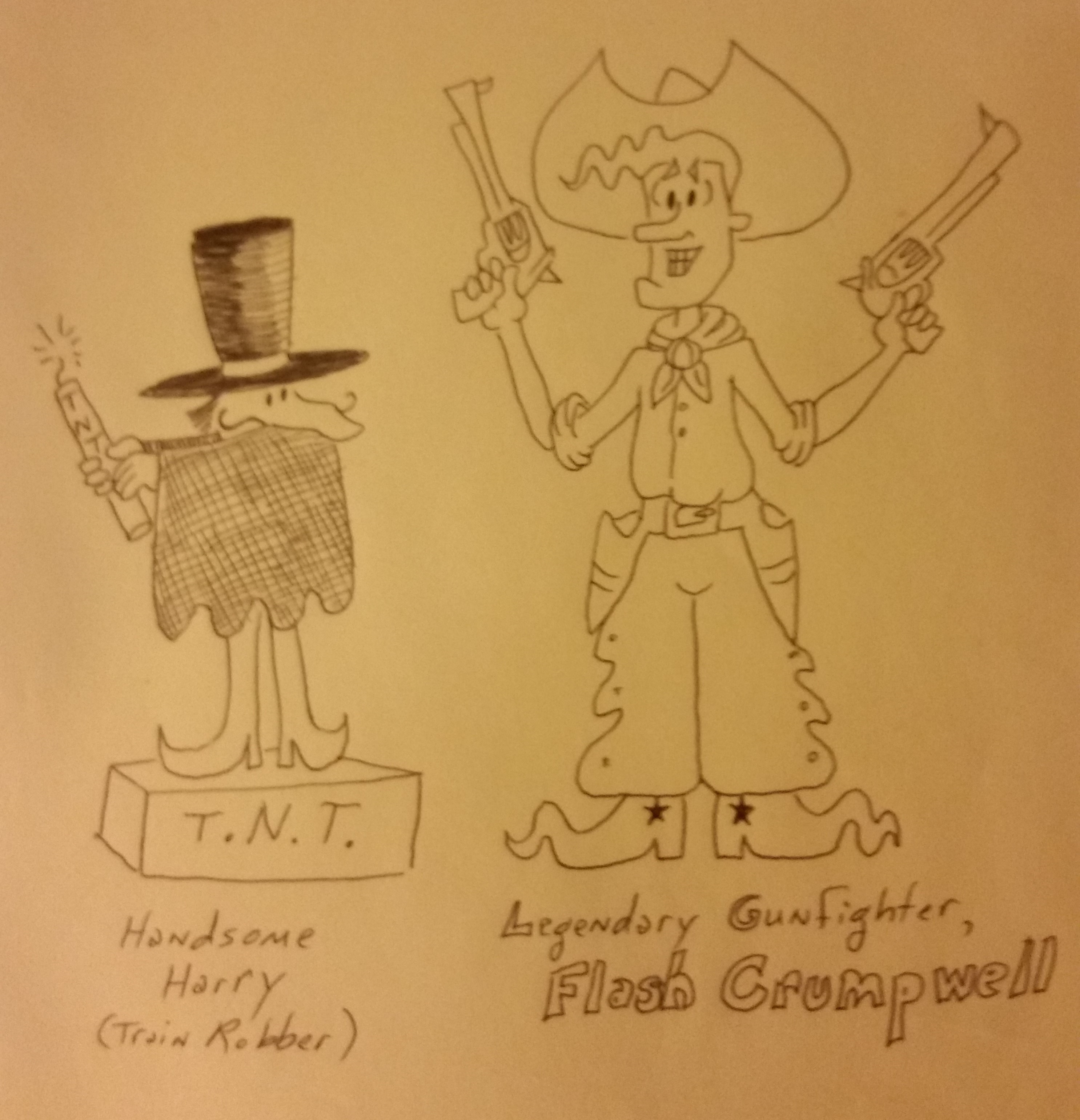 But cartoon dreams are not all animalized, and not all borrowed from elsewhere. I am capable of making up my own characters too that don’t satirize and plagiarize and turn me into a toon-thief. If you visit Crumpwell’s Wild West Ranch, there are one-of-a-kind characters that you might meet there too.