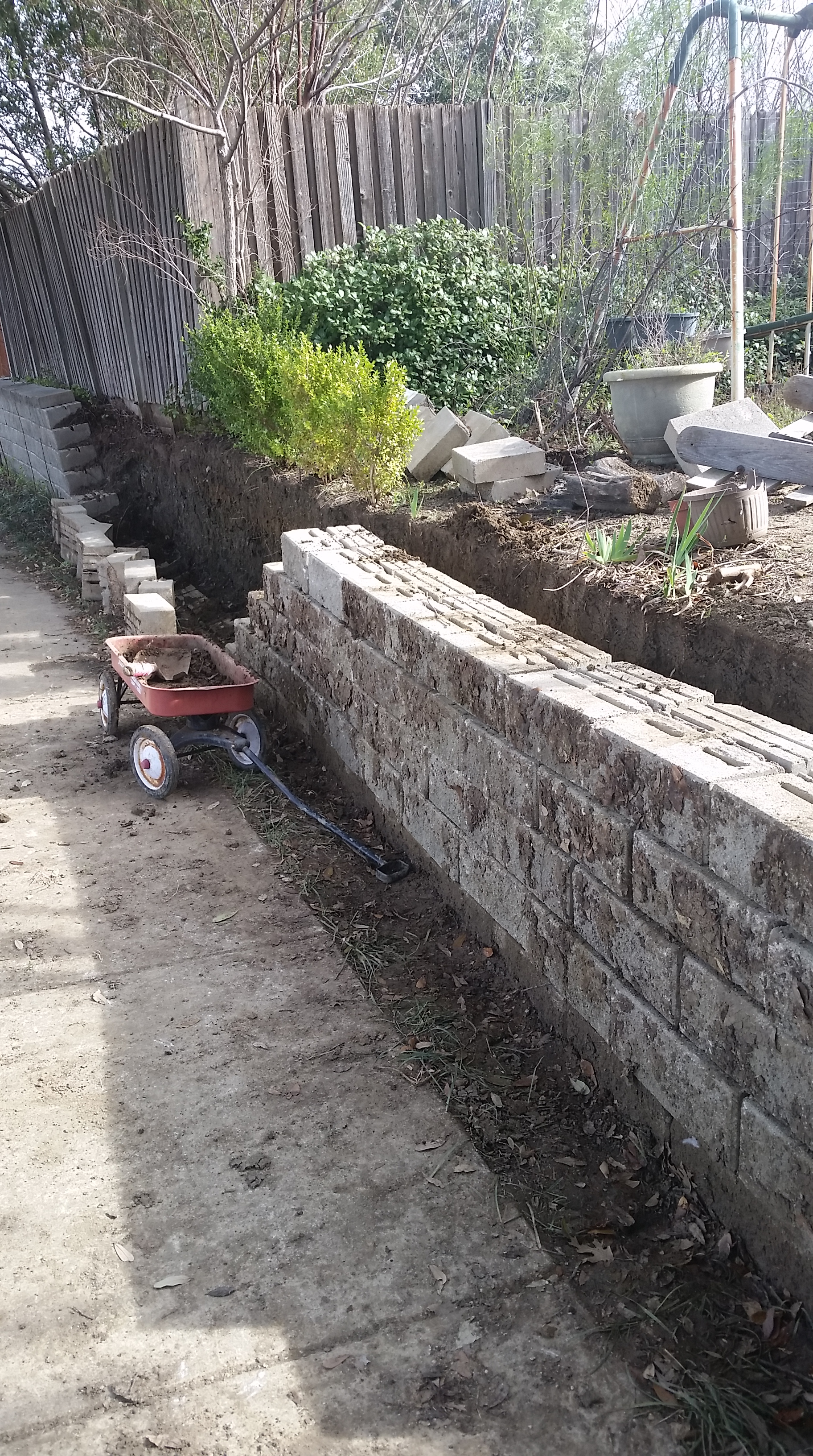 The retaining wall that keeps the yard from flowing downhill into the park and down to the creek, is now growing back upwards, visibly straighter and better grounded than it was before.