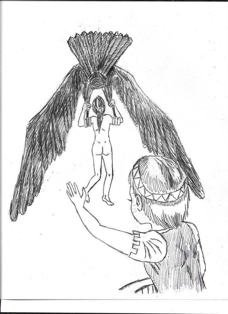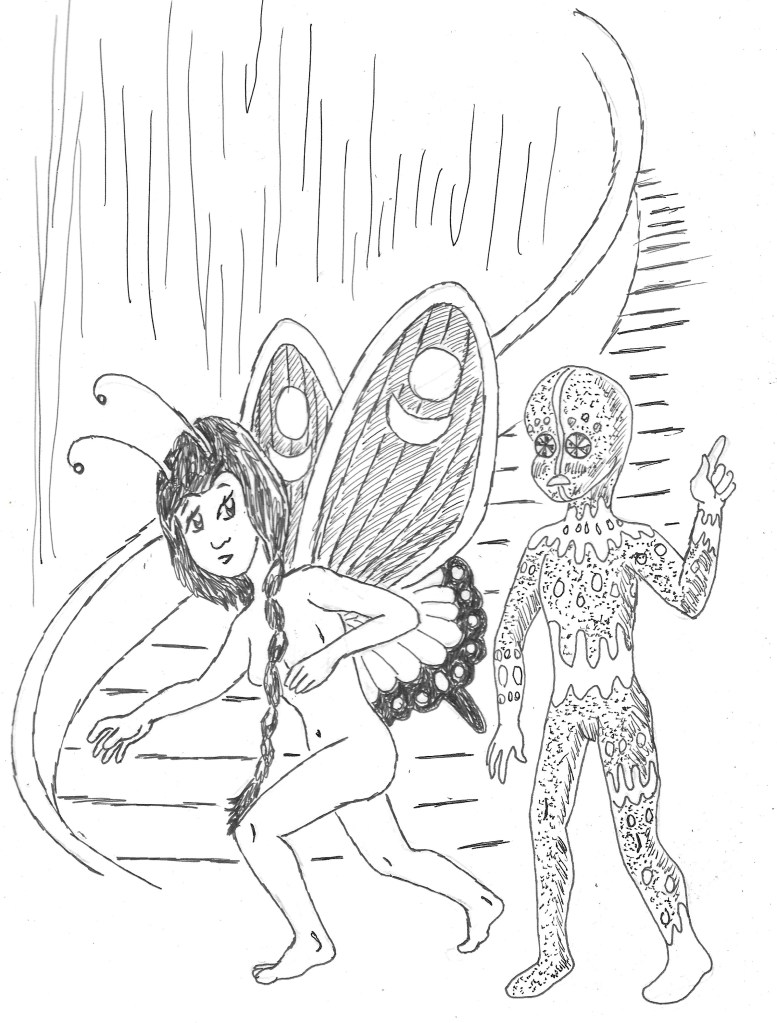We found ourselves quickly climbing upward on the castle’s winding central staircase. We passed many Pixies with various animal and bug-like shapes. There were large numbers of Sylphs and Elves and Brownies and Butterfly Children also. I wondered if anybody had ever counted how many lived in this tree-castle. Bob had told me that it had an extensive underground city in the roots of the willow tree too. Could Dolly have been counting them for some reason?